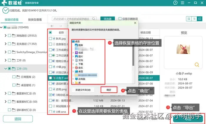 步骤2: 等待扫描结束后,选择需要恢复的文件后点击“导出”,最后在弹窗上选择恢复表格的存放位置。
