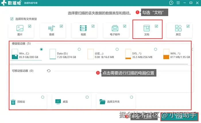 步骤1: 打开软件,再选择自己需要恢复的文件类型(建议直接选择“文档”)和扫描位置(即表格丢失的位置),然后启动软件开始扫描;