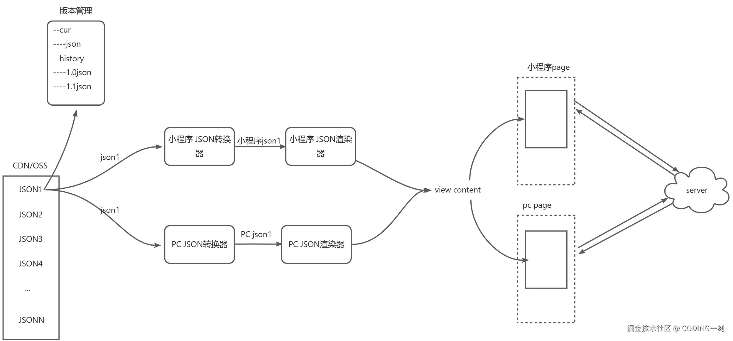 PC、小程序统一走JSON配置化页面生成,形成完整的组件库及JSON转换器,同业务复用JSON,JSON远端部署(CND\OSS),随时改随时生效