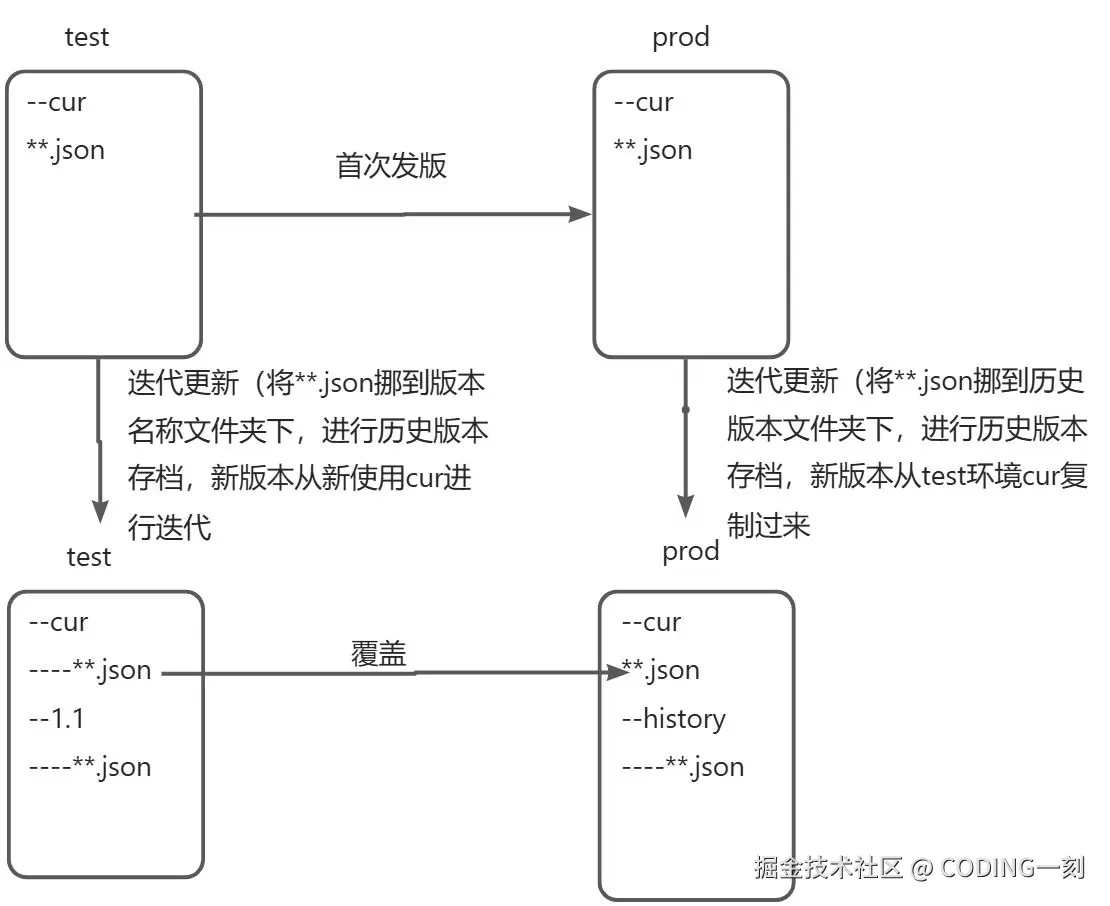分别建立各环境JSON文件夹分别为dev/test/stag/prod,此文件夹在只会存当前使用的json,历史版本用版本号文件夹存