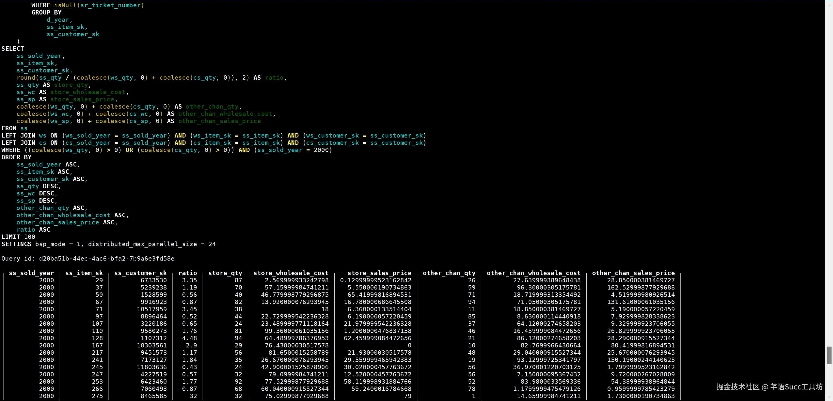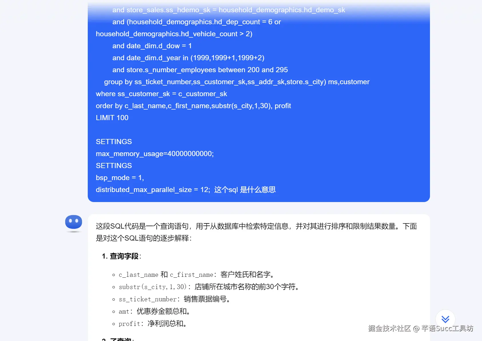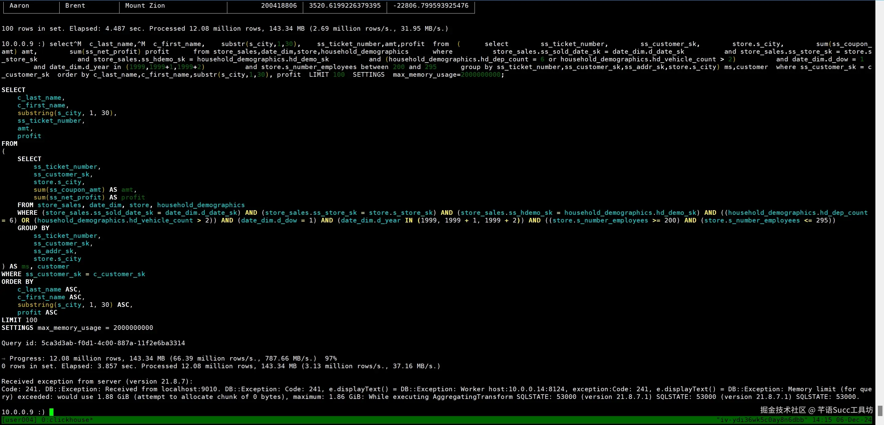 总的来说,这个SQL查询是为了找出符合特定条件的客户,他们在特定日期的购买行为(使用优惠券和产生的利润),并且这些客户的家庭统计信息符合特定的条件。查询结果按照客户的姓名和城市进行排序,并限制输出结果的数量。同时,通过特定的设置来优化查询性能和资源使用。