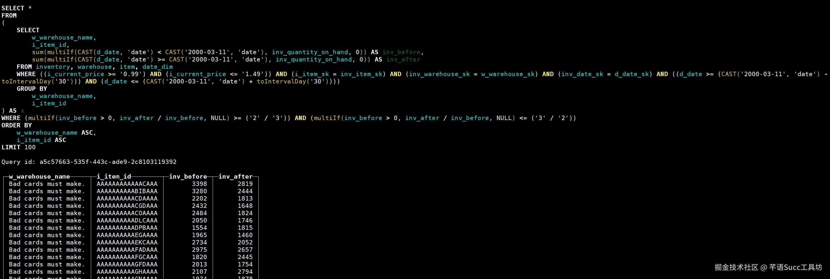 group by w_warehouse_name, i_item_id) x
