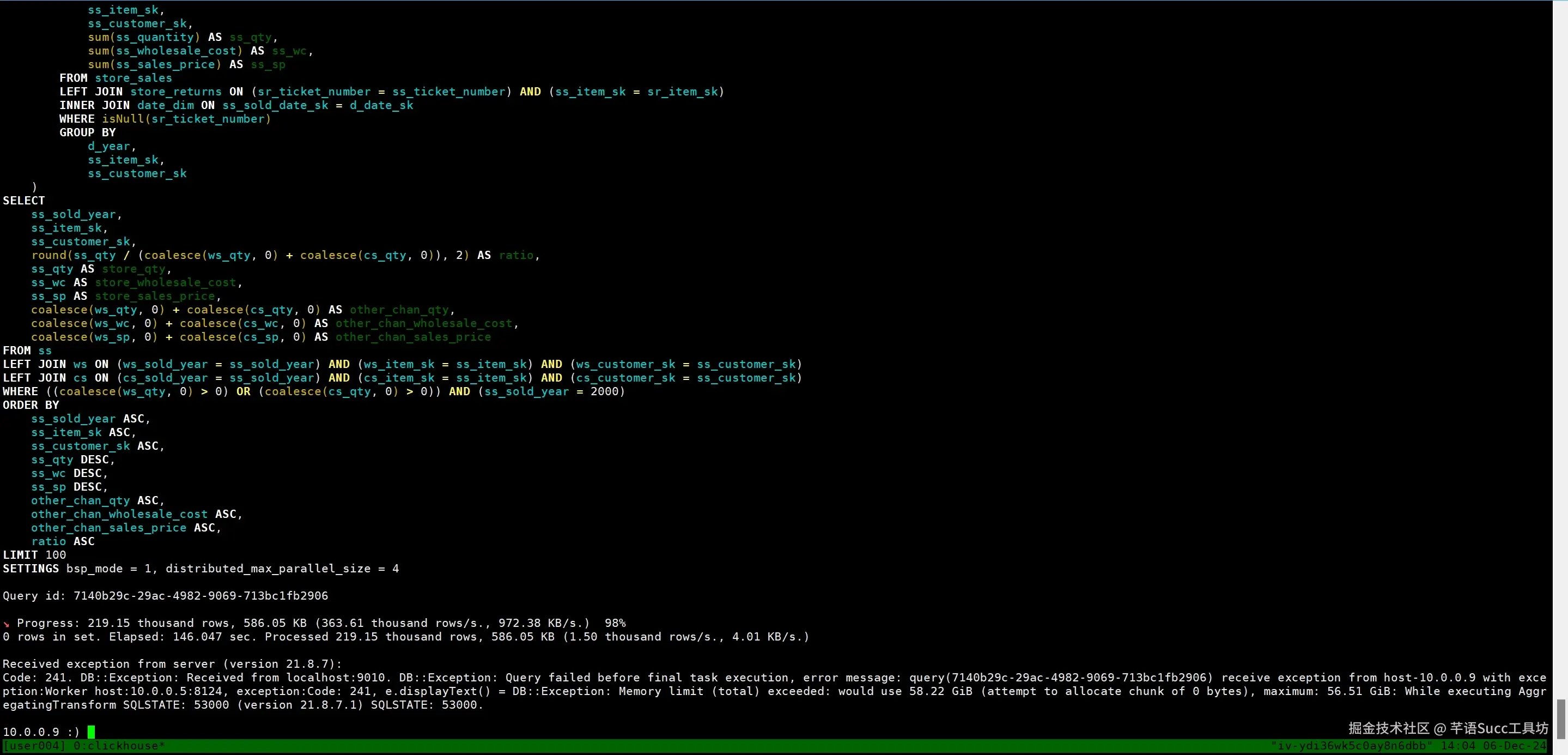 max_memory_usage=40000000000:设置查询过程中可以使用的最大内存量。bsp_mode = 1:启用批量同步处理模式,这是一种数据处理模式,可以提高大规模数据处理的效率。distributed_max_parallel_size = 12:设置分布式查询中的最大并行度为12,意味着查询可以同时在最多12个并行任务中执行。