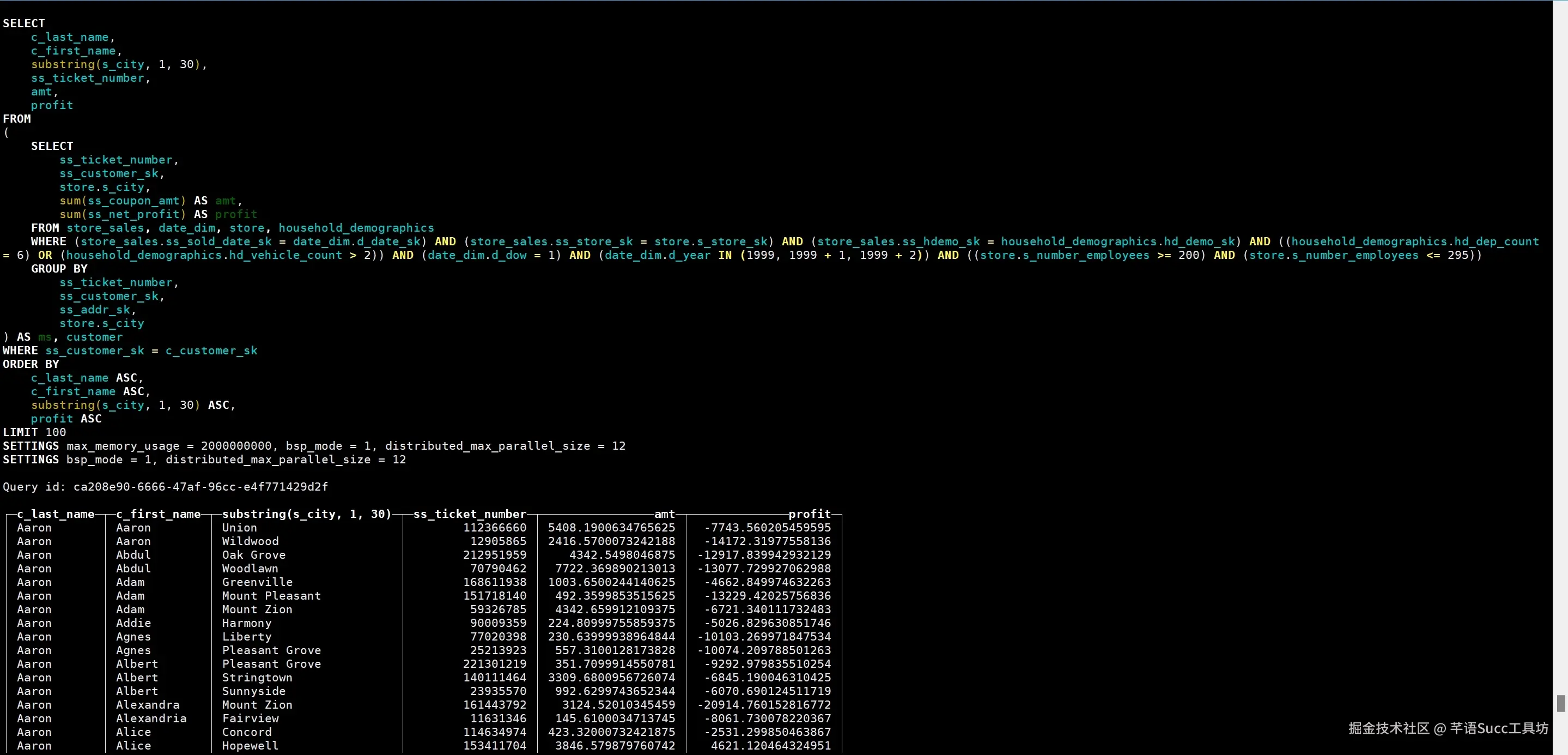 c_last_name和c_first_name:客户姓氏和名字。substr(s_city,1,30):店铺所在城市名称的前30个字符。ss_ticket_number:销售票据编号。amt:优惠券金额总和。profit:净利润总和。- 子查询: