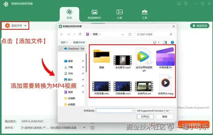 第一步:在数据 蛙视频转换器首页上,点击【添加文件】,添加需要转换为MP4视频格式的文件。