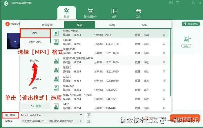 第二步:点击界面下方的【输出格式】选项,选择【MP4】格式。