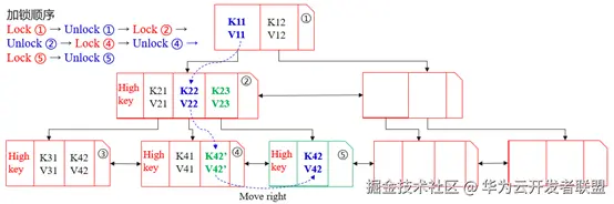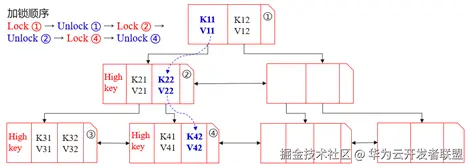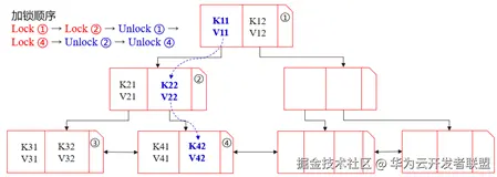 首先,查询事务会锁住根节点①,然后,利用二分查找找到<K11, V11>。接着,事务会先释放节点①的锁,再锁住节点②,再利用二分查找找到<K22, V22>。紧接着,事务会先释放节点②的锁,再锁住节点④,最后通过二分查找找到目标值<K42, V42>后,再释放节点④的锁。