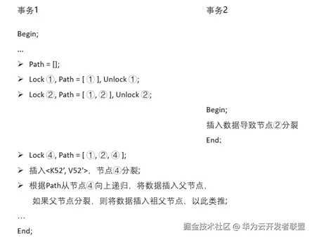 事务1需在Blink Tree中插入新元组<K61’, V61’>。首先,从根节点到叶子节点遍历查找插入位置,在Unlock节点②和Lock节点④之间的时间段内,有事务2导致Blink Tree发生了分裂(节点②分裂成节点⑤),事务1找到节点④为插入节点,但发现节点④空间不足,遂节点④发生分裂,随后,事务1会根据记录的路径向上递归至父节点插入新的节点信息。当遍历到节点②时,事务1发现节点②并非节点④的父节点,于是从节点②开始move right,直到找到节点④真正的父节点。
