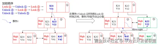更直观地,以图4的例子来说,当查询事务在执行到Unlock ②与Lock ④之间的时间段时,如果有另外一个写事务插入了数据<K42’, V42’>,这将导致节点④发生了分裂,从而使得目标元组<K42, V42>转移到了新分裂的节点⑤中。