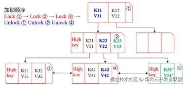 首先,查询事务会先锁住根节点①,然后,通过二分查找找到<K11, V11>,接着锁住节点②,通过二分查找找到<K22, V22>,同时释放节点①的锁。之后,事务会锁住节点④,继续二分查找,直到找到目标值<K42, V42>,再释放掉节点②的锁,最后会释放节点④的锁。