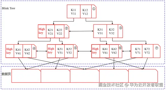 图1中①到⑦都是独立的索引页面,GaussDB默认页面大小都是8K,采用堆表引擎结构,其中索引页和数据页分开存储。索引的叶子节点保留有指向数据页的行指针<K, V>,相比于传统B+树索引,Blink Tree具有以下特点: