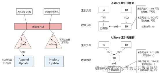 图7中的右图,展示了Astore和Ustore索引列更新情况下的差异。在Astore中,更新操作会先将旧元组4标记为删除,再插入新元组10。由于BTree索引上4和10对应的TID不同,单次扫描中只有一个能通过可见性检查。