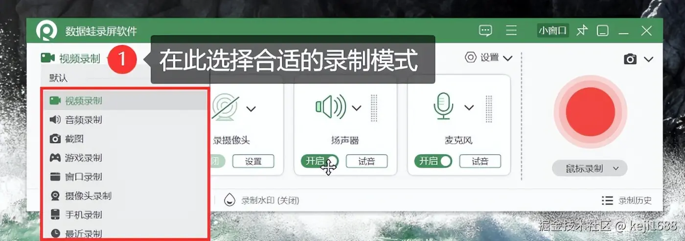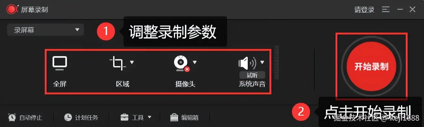 步骤1:打开软件后,根据录制内容选择所需的录制模式,调整录制区域与参数(如摄像头、声音来源等),点击 【开始录制】 按钮。