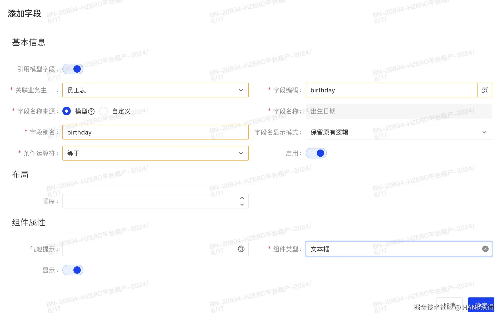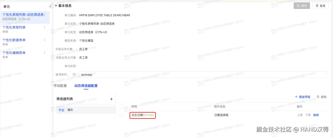员工定义的个性化表格-动态筛选条下维护出生日期字段,具体配置如下: