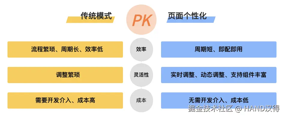 通过以上的对比,我们可以发现页面个性化模式在整个配置、应用流程均非常简单。甚至可以由业务人员独立完成,极大的简化了操作流程和使用门槛 。