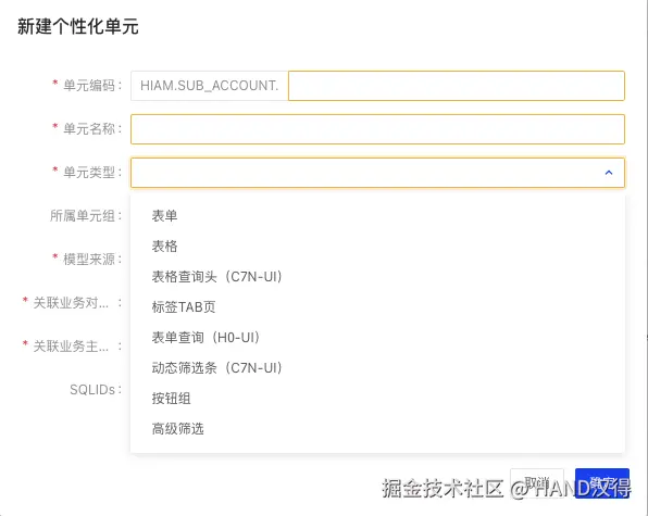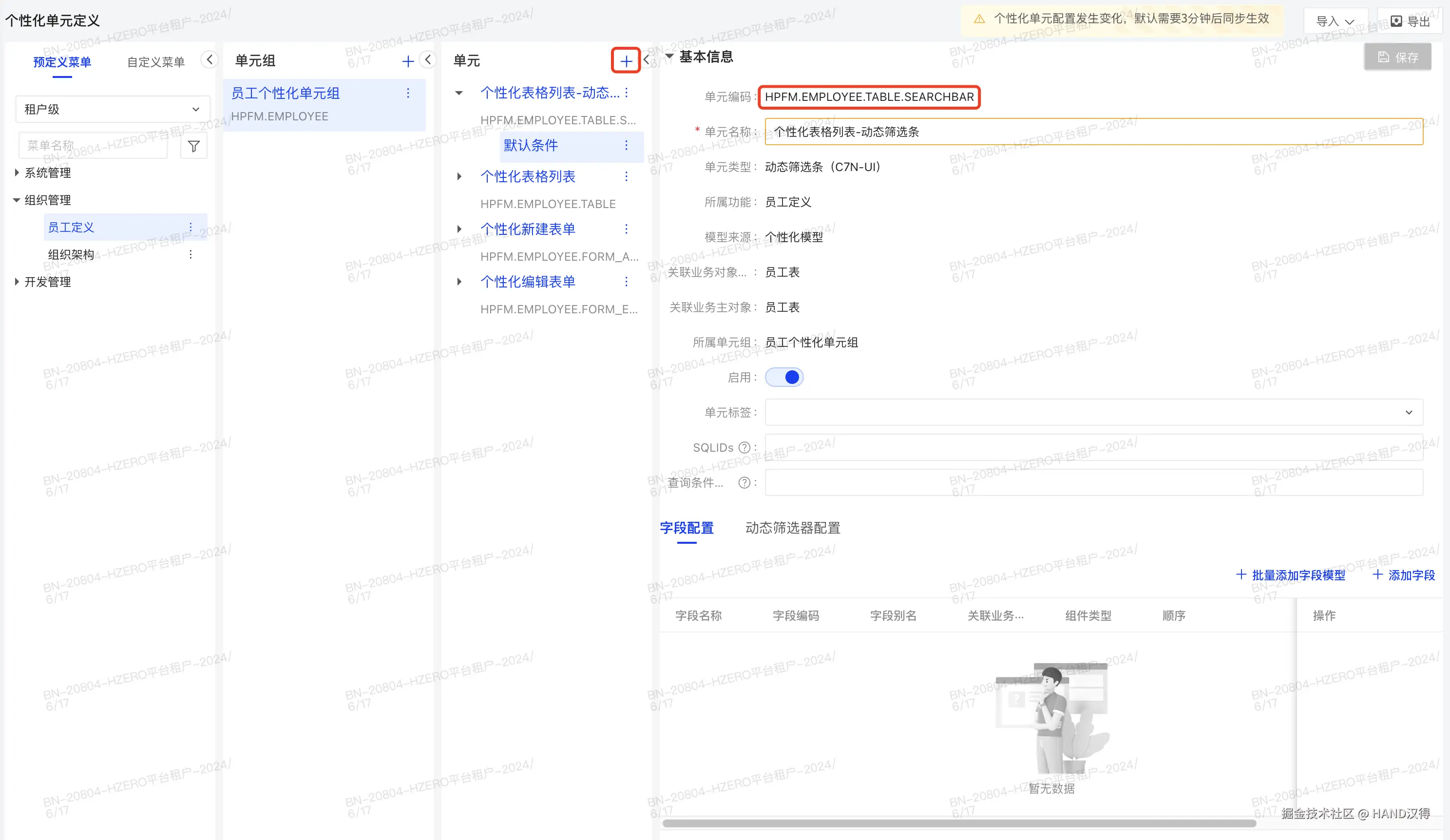 进入页面个性化页面,点击员工定义下的单元组添加动态筛选条编码(编码建议规则为 模块名.页面.个性化功能),如下图所示: