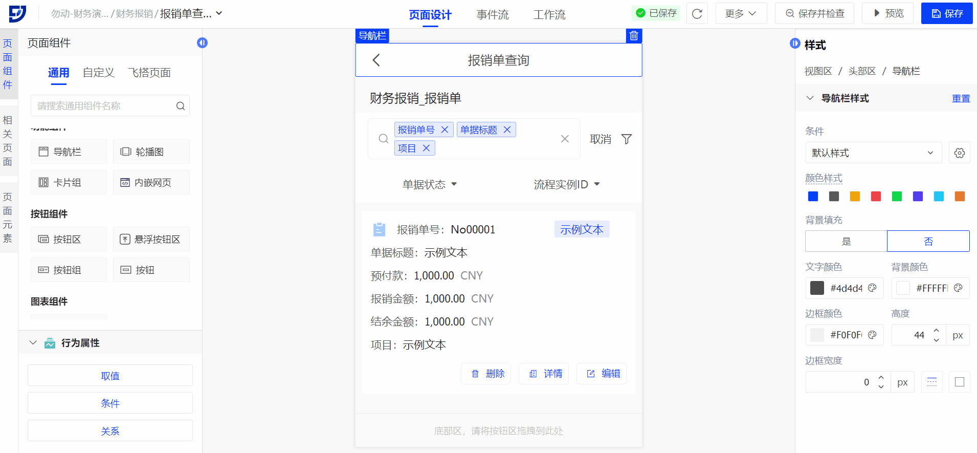 - 在报销单查询页面的导航栏右侧拖入按钮,调整按钮属性和样式并配置“新建报销单”事件流;