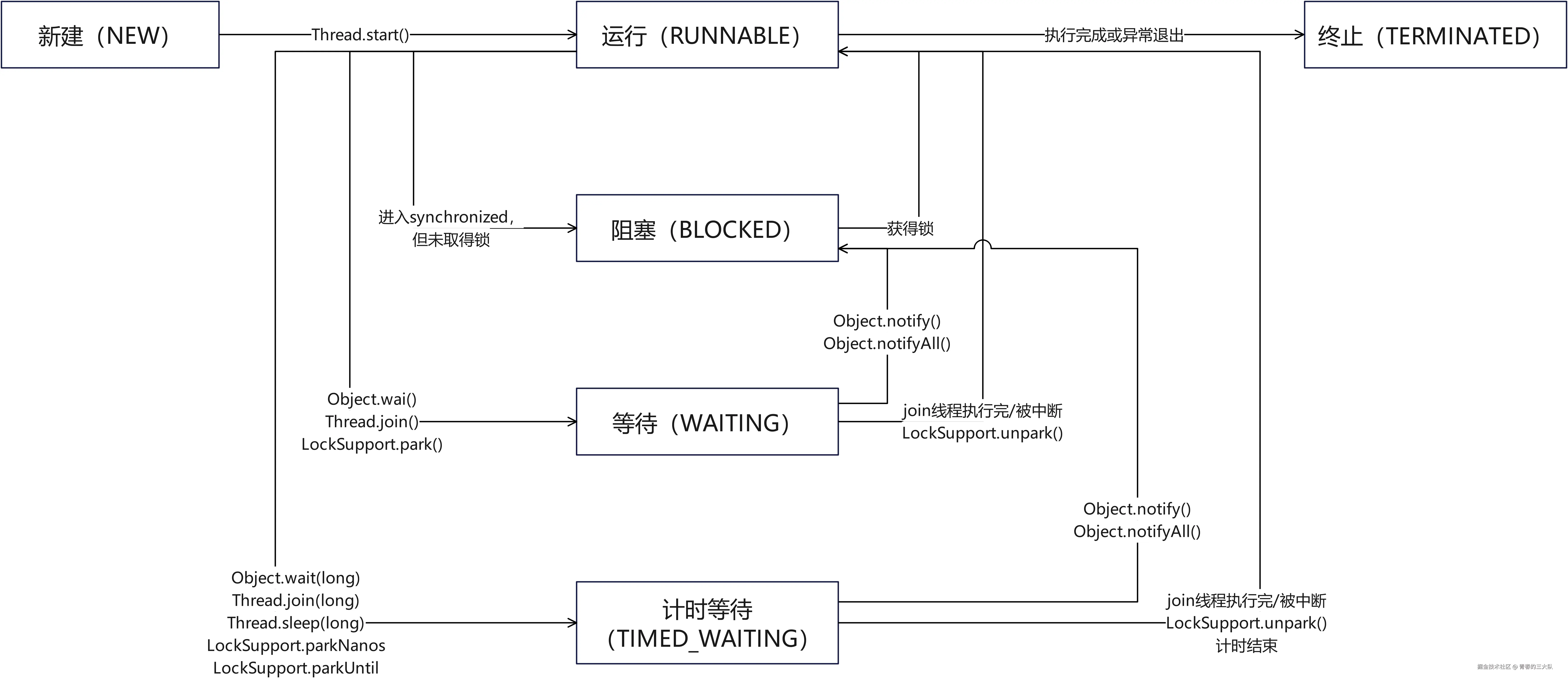 当一个线程执行了Object.wait()(设置超时时间)、Thread.join()(设置超时时间)、Thread.sleep()(设置超时时间)或者LockSupport.parkNanos/LockSupport.parkUntil后,该线程的状态从 RUNNABLE 切换到 TIMED_WAITING 状态。
