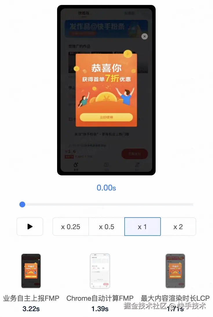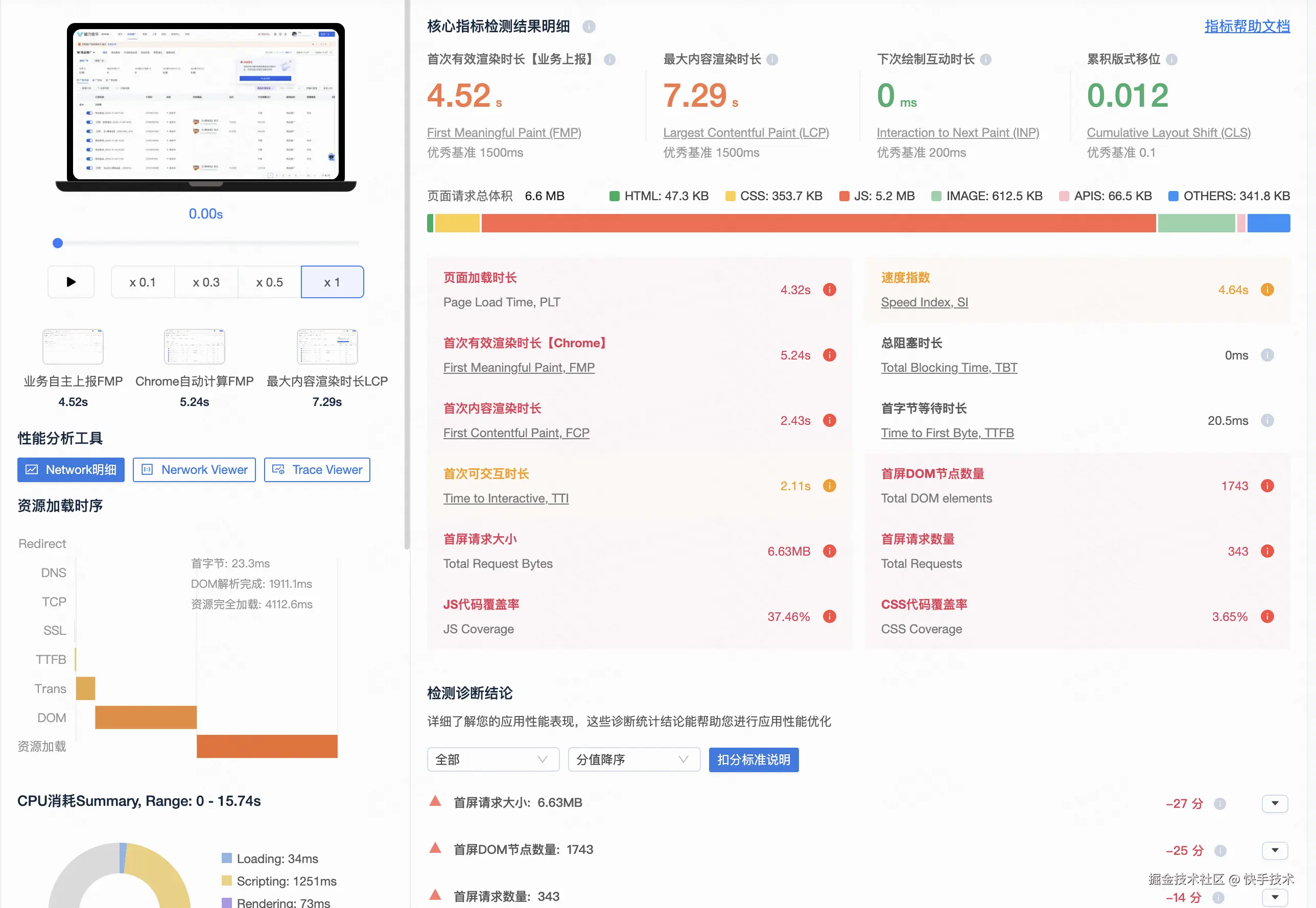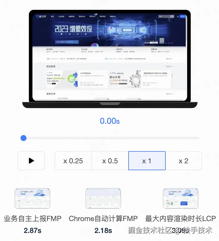 - 其次,通过录屏方式记录页面加载过程中的关键性能指标,并截取关键帧以便一线开发团队了解上报FMP时的页面状态;