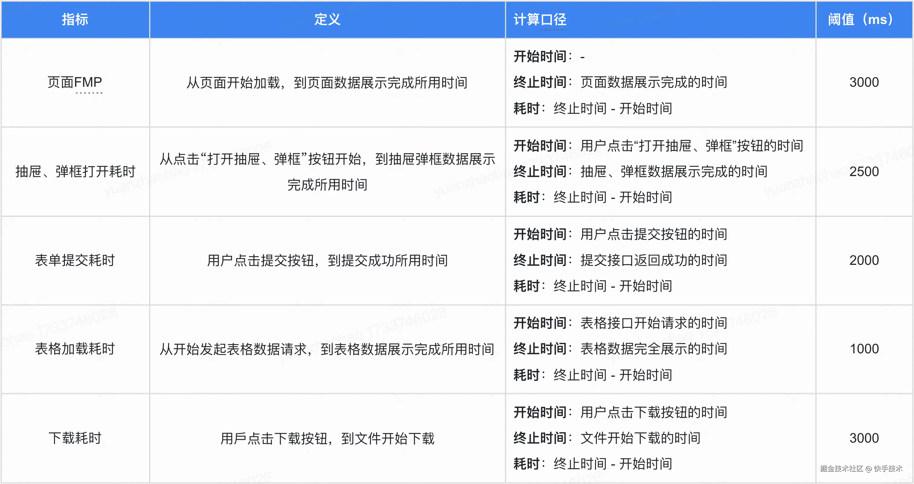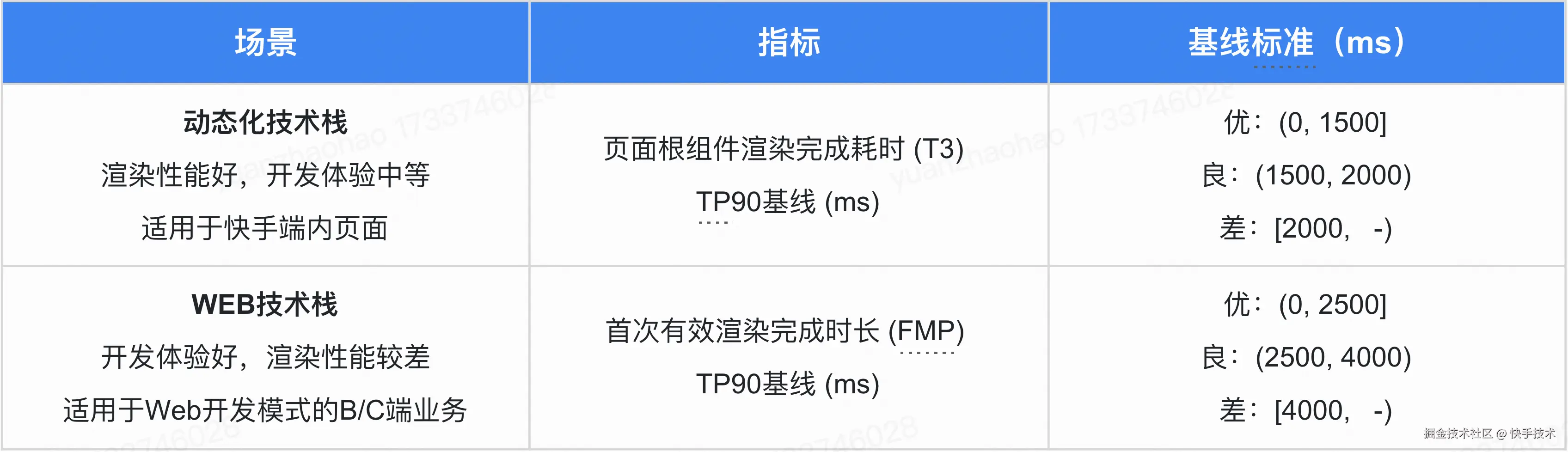 在快手商业化团队,我们深知页面性能对提升用户体验的重要性。因此,我们基于快手内部动态化技术的特点,并参考了Google的性能标准,制定了快手商业化页面性能达标的北极星指标(如下)