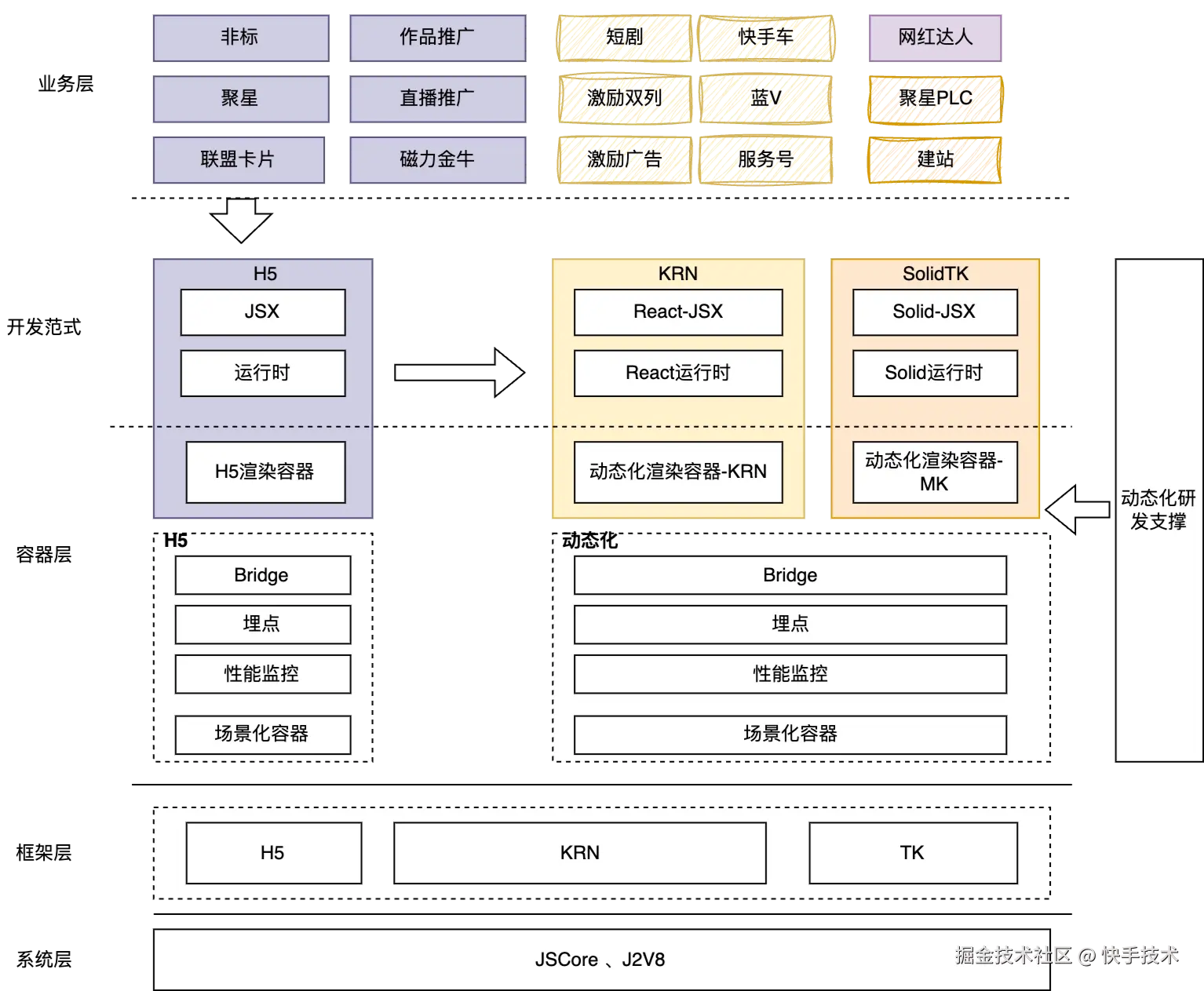 举个例子,快手商业化大前端团队以磁力建站落地页作为试点,完成动态化改造后的性能收益提升35%以上,性能提升也带来了显著的业务CVR和预期消耗增长。因此,如下图所示,我们搭建了一套端内页面的技术选型标准,完善动态化技术基建,持续推动端内项目完成动态化改造。