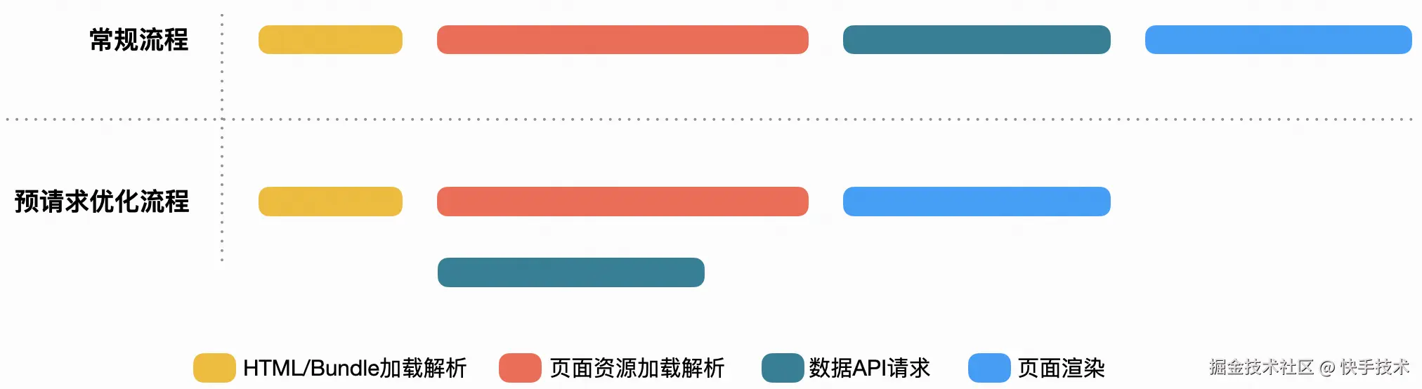 如下图所示,常规页面流程可简化为「HTML/Bundle加载解析 -> 页面资源加载解析 ->数据API请求 -> 页面渲染」4个过程,数据预请求的核心思路是最大限度提前页面数据加载时机,提前获取当前或未来需要的数据,以便用户在访问时能够更快地体验到完整的内容。