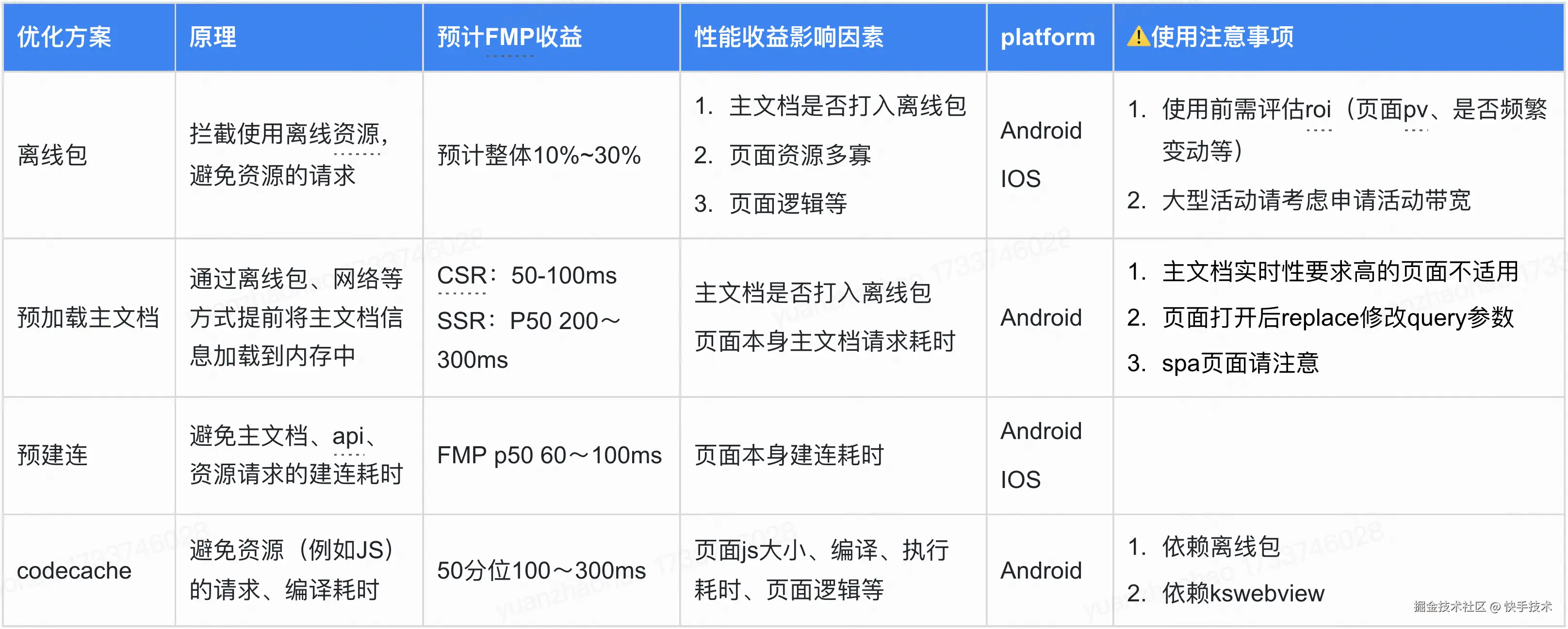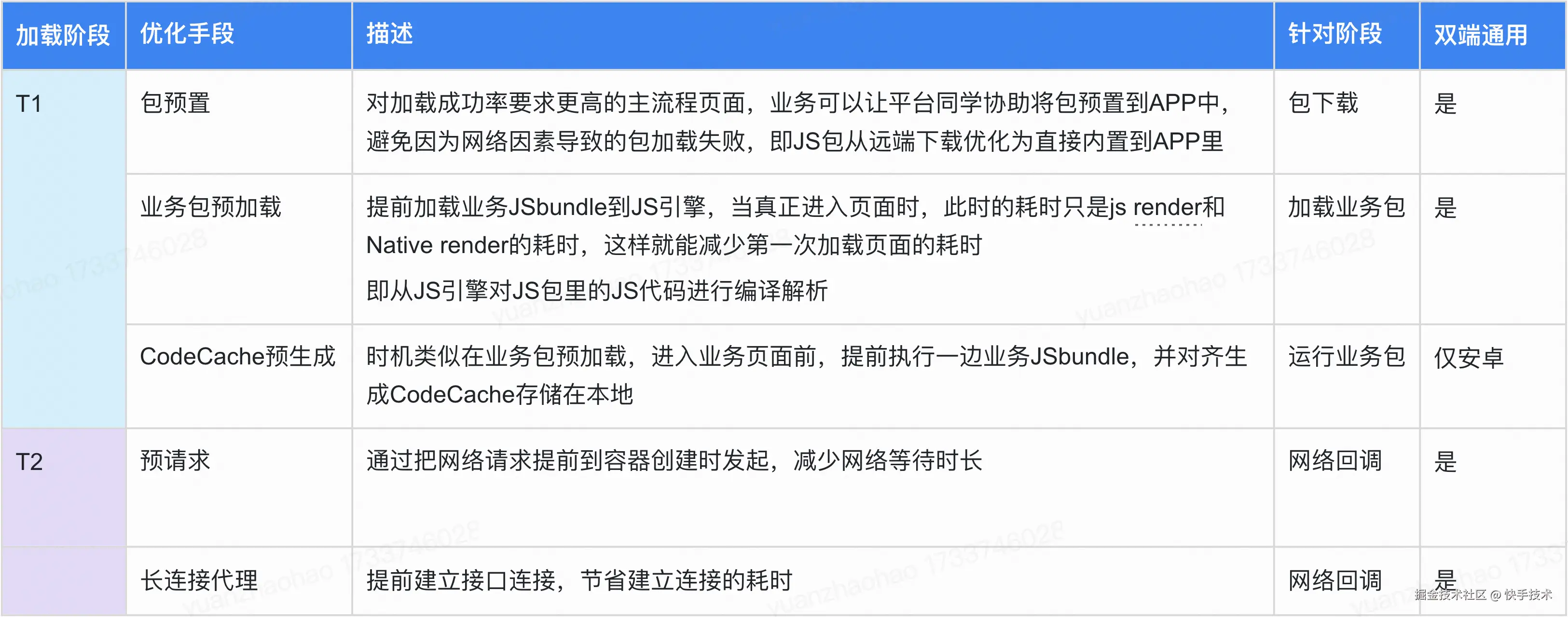 针对H5页面,常见的优化手段包括预加载、预建连、离线包、code cache等,而对于KRN页面,则采用包预置、业务包预加载、code cache、预请求等策略。