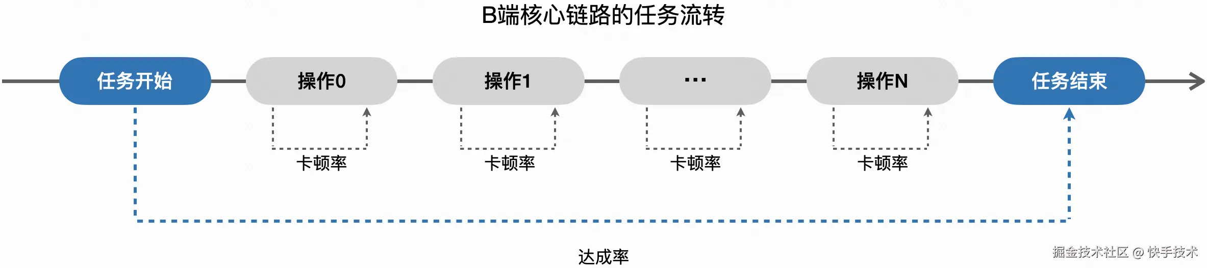 为了更好地监控B端系统的用户操作体验和流程完成情况,我们建设以【操作卡顿率】和【任务达成率】为核心指标的B端核心链路体验度量模型。其中操作卡顿率关注核心路径的操作响应体验,任务达成率则关注核心任务流程的完成情况。