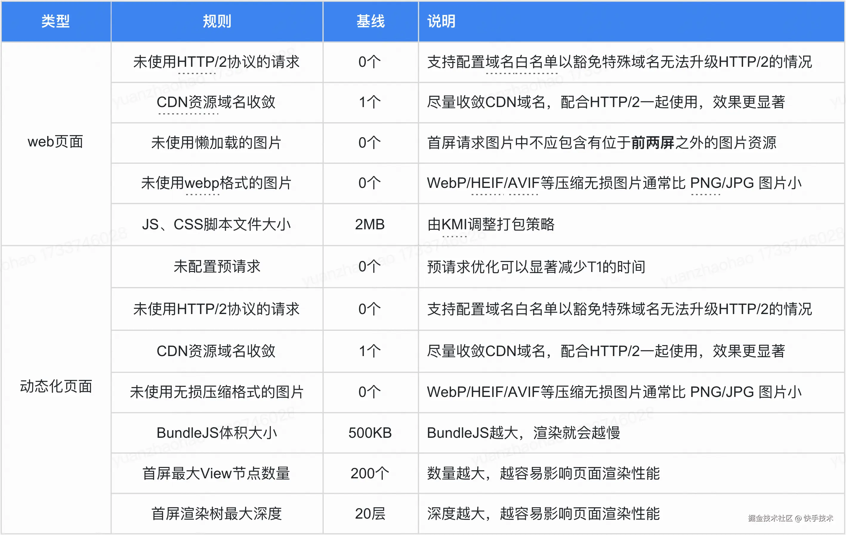 如上面的时序图所示,主要结合天穹平台(快手内部的前端代码审查平台)实现性能维度的天穹平台插件,在前端研发流程上建立性能防劣化机制,具备性能维度下的任务打标、流程阻断、豁免审批、结果触达等性能卡口能力。目前已为快手商业化端侧核心项目加入卡口,一期选取5项web指标、7项动态化指标作为卡口规则,规则详见下表: