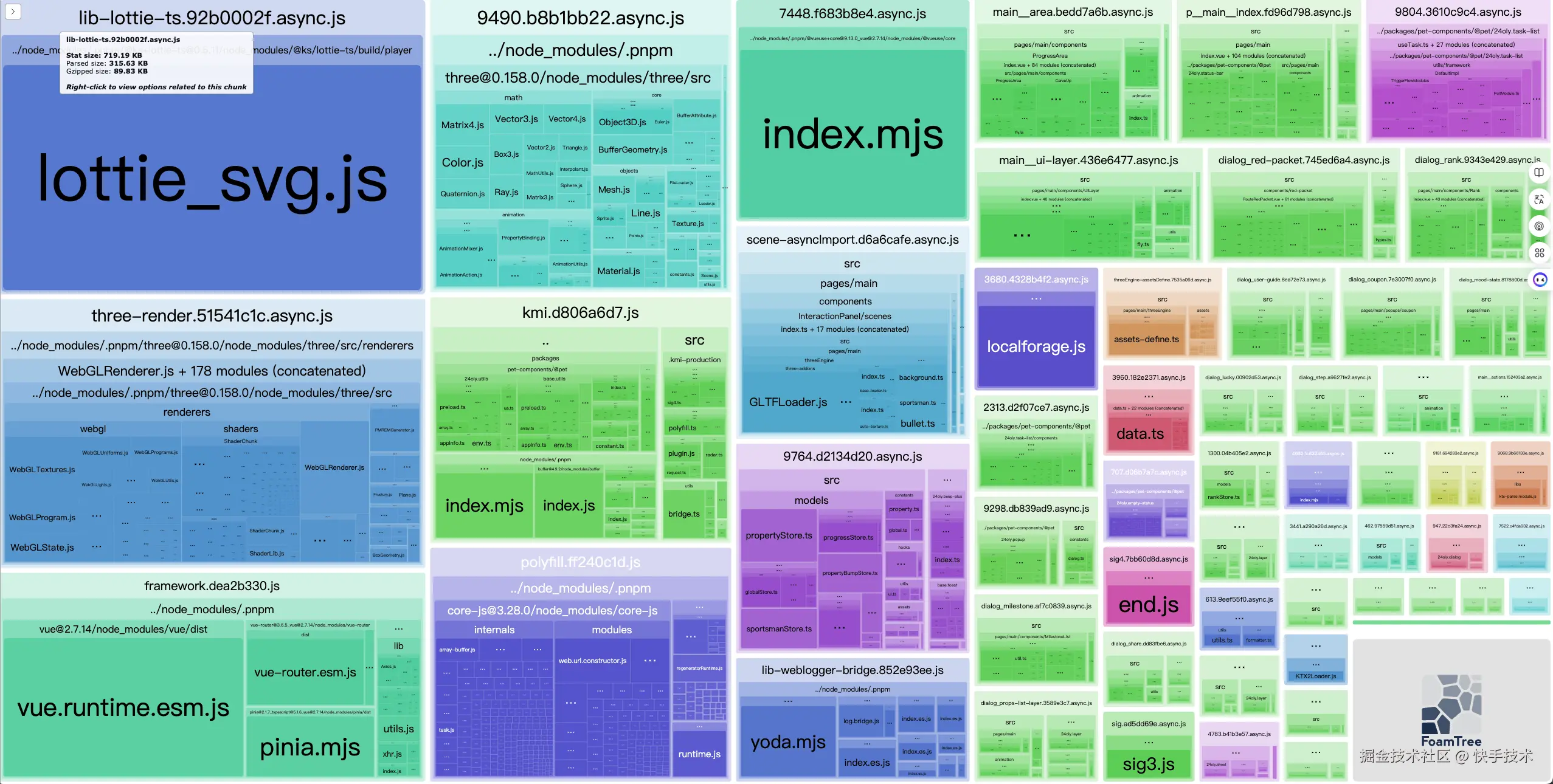在默认使用granularChunks策略的基础上,Kmi针对各核心项目定制化打包优化,以最大化提升商业化前端应用的性能和用户体验。此外,Kmi在每次构建后自动生成详细报告,帮助团队深入了解每次构建过程中的关键差异,为代码质量和构建速度的持续优化提供数据支持,也为排查问题提供了快速还原现场的能力。
