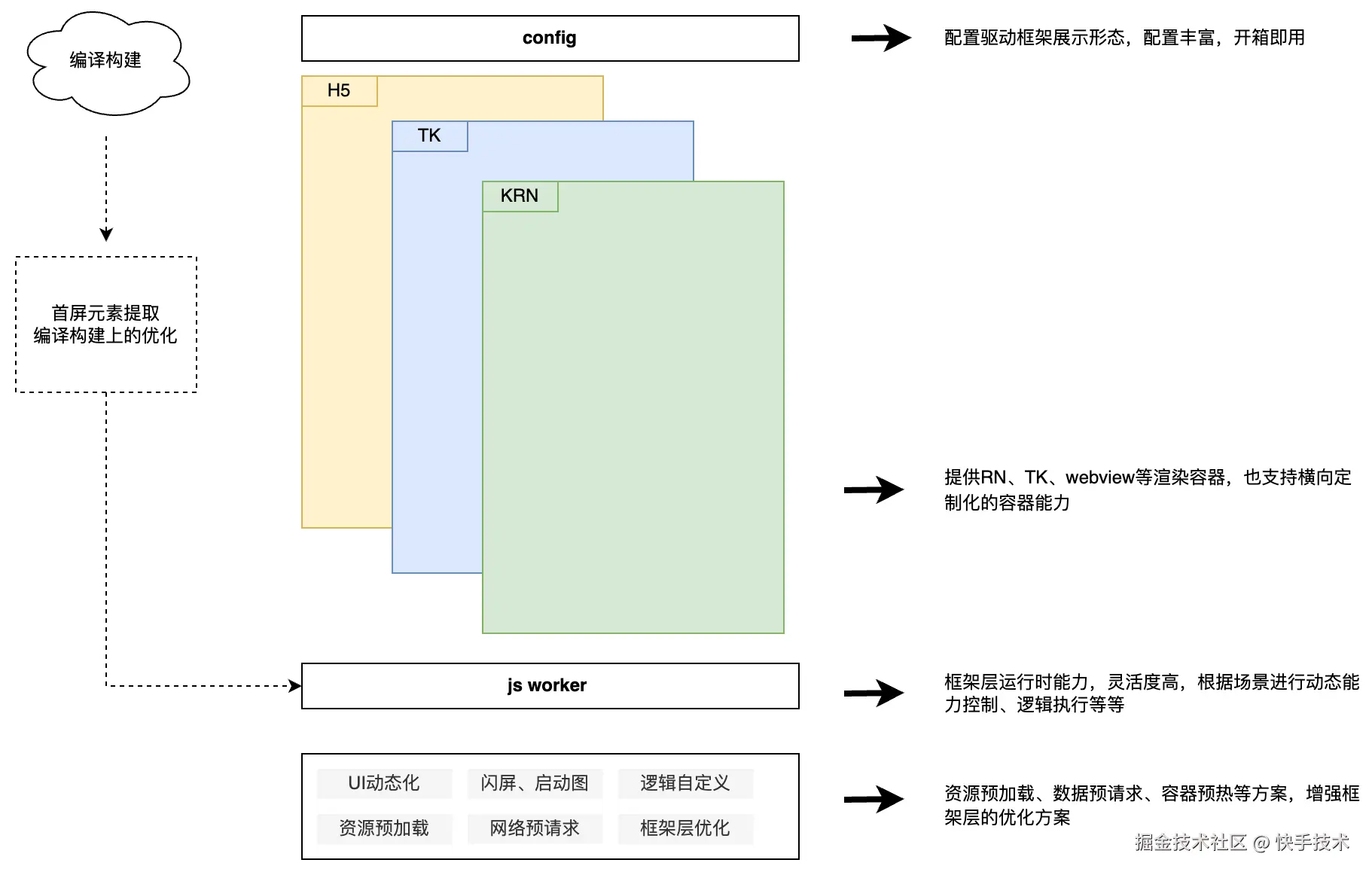容器能力:提供RN、TK、webview等渲染容器,并提供定制化的容器能力,如资源预加载、数据预请求、容器预热等方案