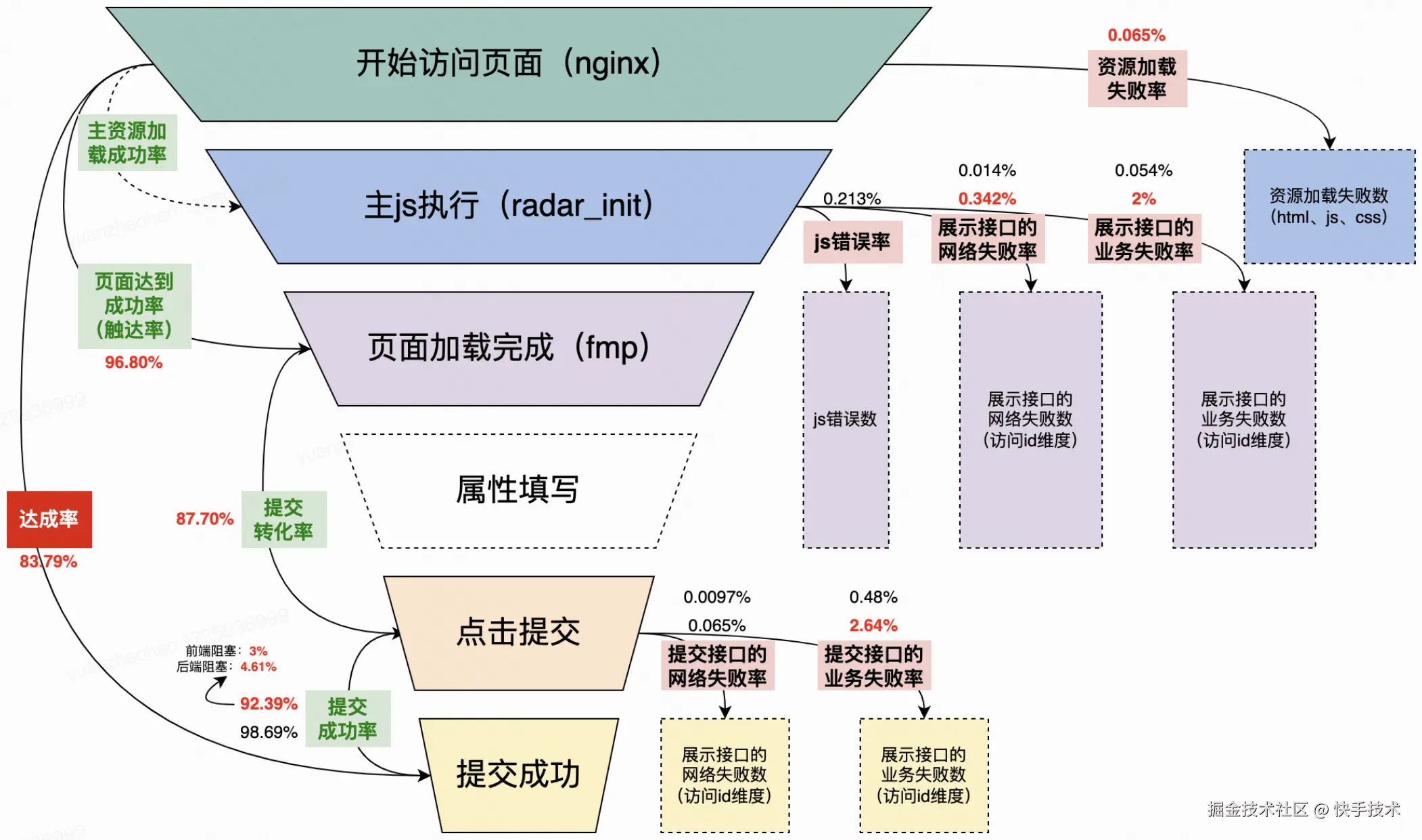任务达成率是衡量用户成功完成任务或达成目标的比例,其计算基于提交成功数(经过访问ID去重处理)与页面开始加载数的比值。这一指标深受前端静态资源可用性、后端接口服务稳定性以及用户个体差异等多重因素的影响。