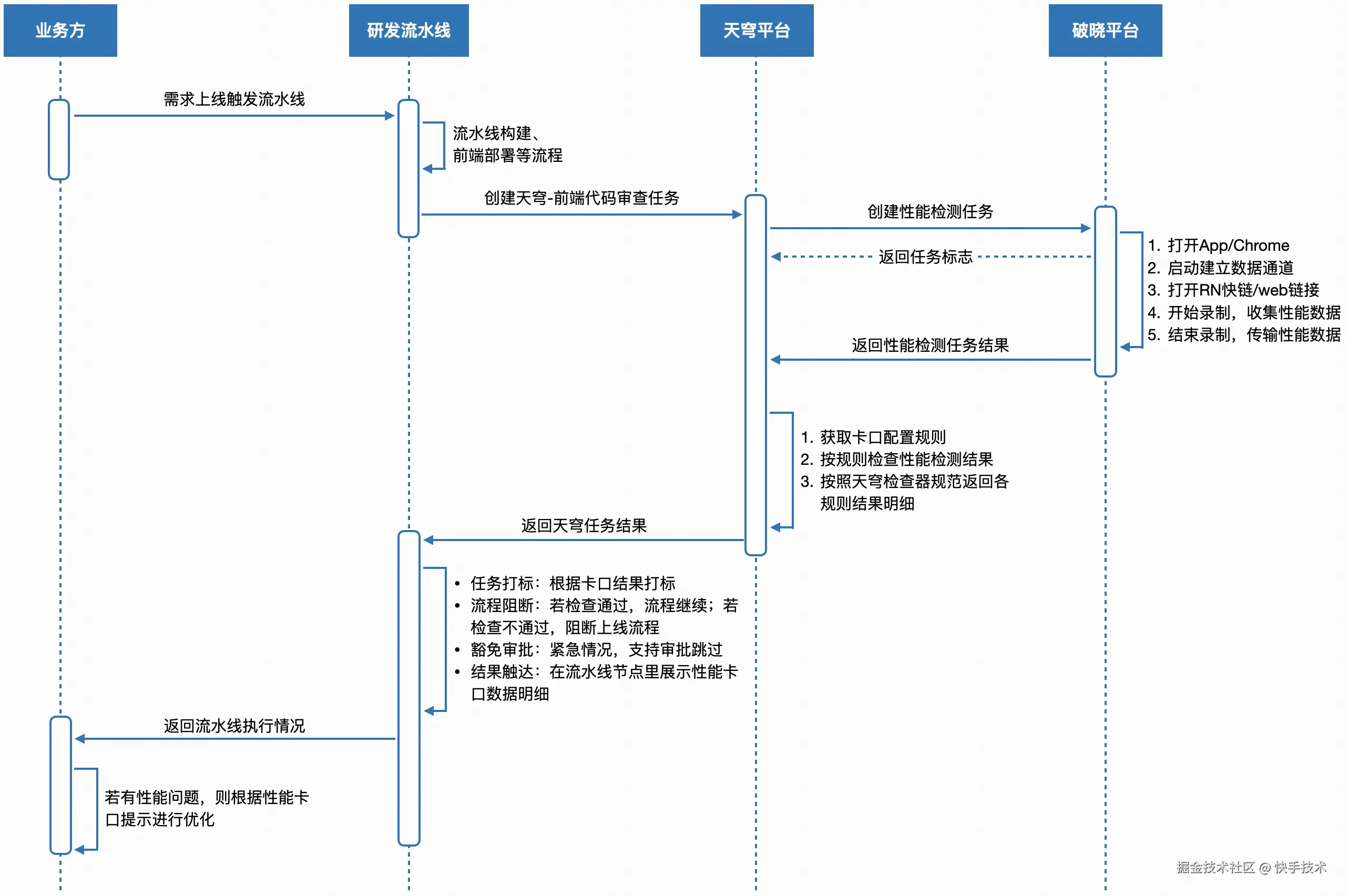 如上图所示是当前FMP置信能力的效果图,FMP置信能力的实现仅是起点,更重要的是产品化能力的落地。如下方的时序图所示,我们在破晓平台(快手内部的性能评测平台)实现FMP置信的产品化能力:
