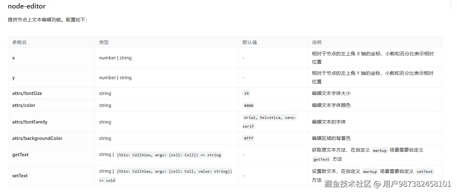 #### ### 问题2: #### 问题描述 当修改节点内的文本的位置后,再双击编辑 文本位置应该是修改后的位置,但是这个位置需要计算 更改 node-editor 中x y 的值  文本右上角对齐 但是 双击编辑会回到原来的位置  x6 官方文章上提供了修改 x,y 的值 可以 改变文本的位置 graph.on('cell:selected', ({ cell, options }) => { console.log(cell.getBBox(), 'options') cell.removeTools() if (cell.isNode()) { cell.addTools([ { name: 'node-editor', args: { y: '0%', x: '0%', attrs: { textAlign: 'left', backgroundColor: 'transparent ', fontSize: cell.getAttrs()?.text?.fontSize, color: cell.getAttrs()?.text?.fill || cell.getAttrs()?.label?.fill || '#000000', fontFamily: cell.getAttrs()?.text?.fontFamily || cell.getAttrs()?.label?.fontFamily } } } ]) }效果图  Y 是生效了 但是 X 值没有生效 #### 解决方法 :text-align 影响了 x 值的修改 但是渲染还有问题.x6-node-tool { .x6-node-tool-editor { text-align: right; } }