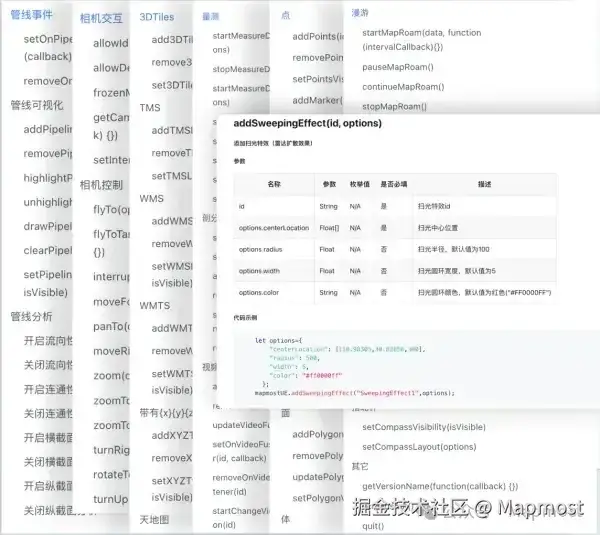 内置相机、图层服务、图层、空间分析、工具、管线、自定义方法等7大类,100+ API,满足多场景应用需求。配备中文文档和代码示例,简单易用,上手轻松。