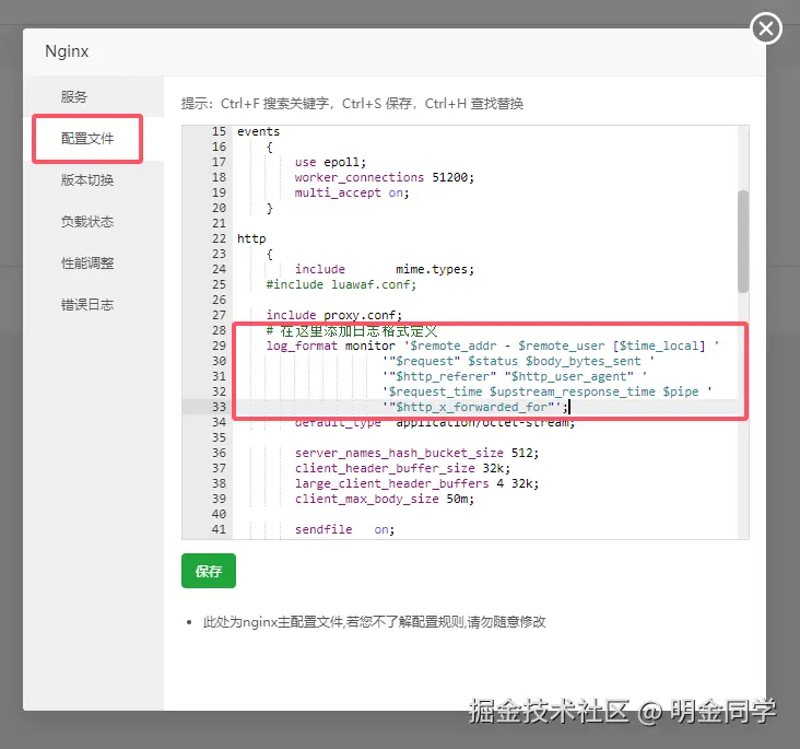 解决方法就是找到Nginx的"monitor"日志格式,如果没有,需要先定义它。在nginx.conf的http块中进行添加。