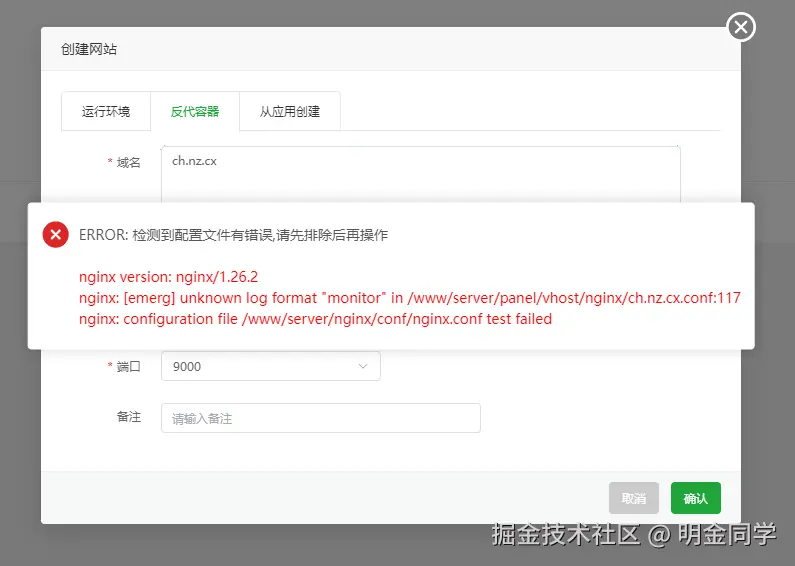 nginx version: nginx/1.26.2\ nginx: [emerg] unknown log format "monitor" in /www/server/panel/vhost/nginx/ch.nz.cx.conf:117\ nginx: configuration file /www/server/nginx/conf/nginx.conf test failed
