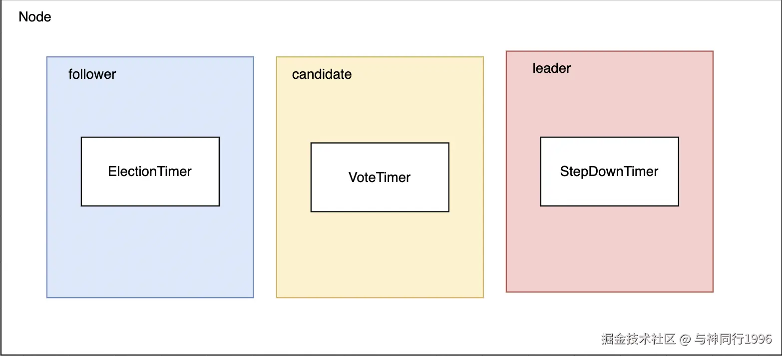 根据我们之前对raft算法的了解,electionTimer大概率是心跳超期发起选举的定时任务,voteTimer则是投票过程中超期的定时任务。相较于我们实现的raft node,这里还多了个Timer -- stepDownTimer,先说结论,这个timer是leader用来自检,并维持与其他节点连接。