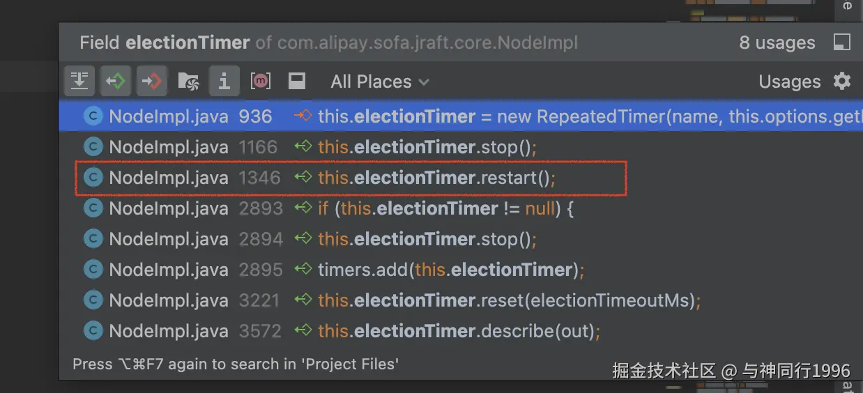 先来定位ET(ElectionTimer)的启动时机,通过IDEA的引用提示,可以看到ET只有在一处被启动。