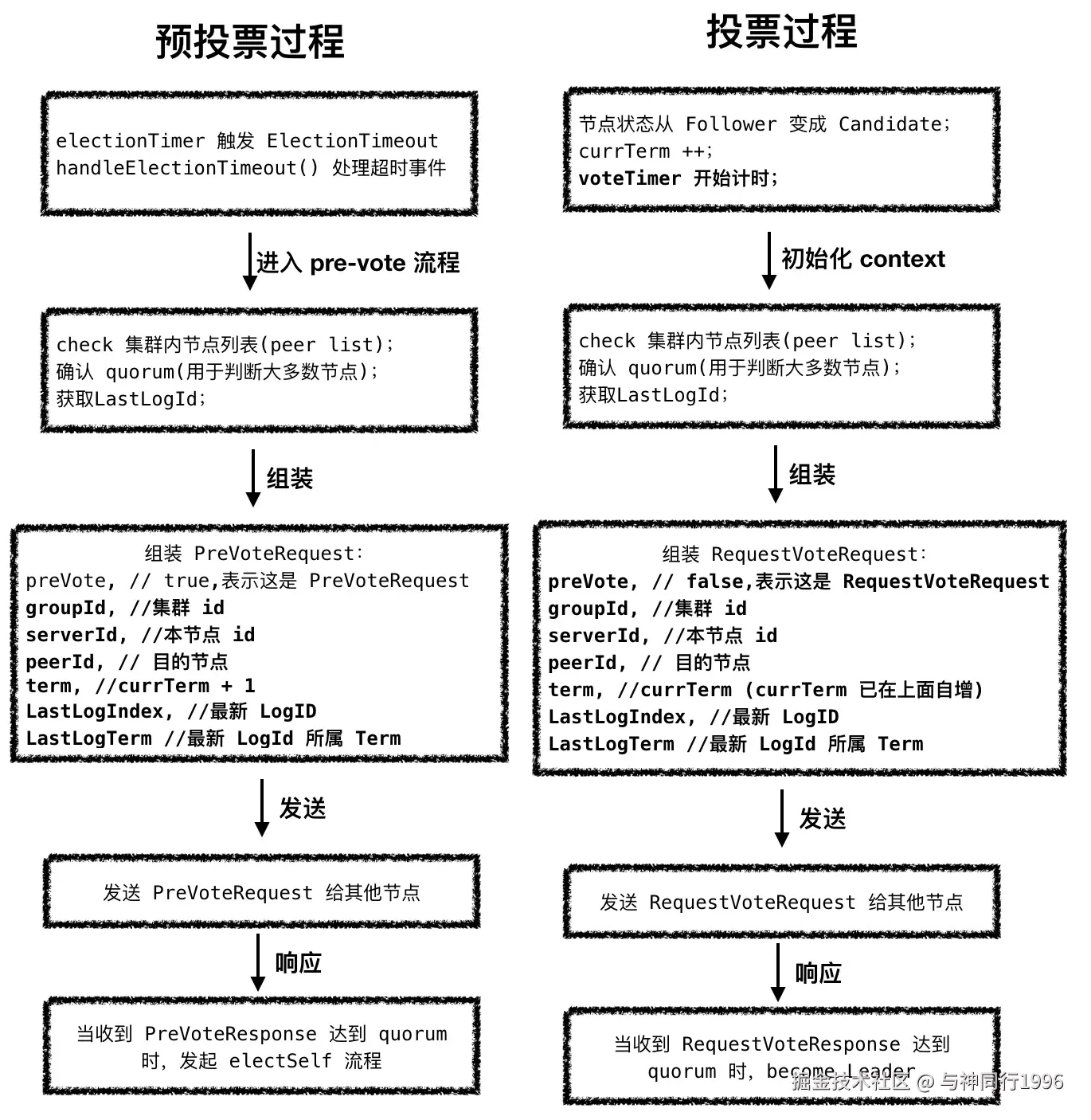 sofa-jraft为了避免上述的情况,额外添加了一个步骤--prevote。顾名思义,prevote只是发起一次预投票,只有通过预投票的节点才能发起真正的投票。