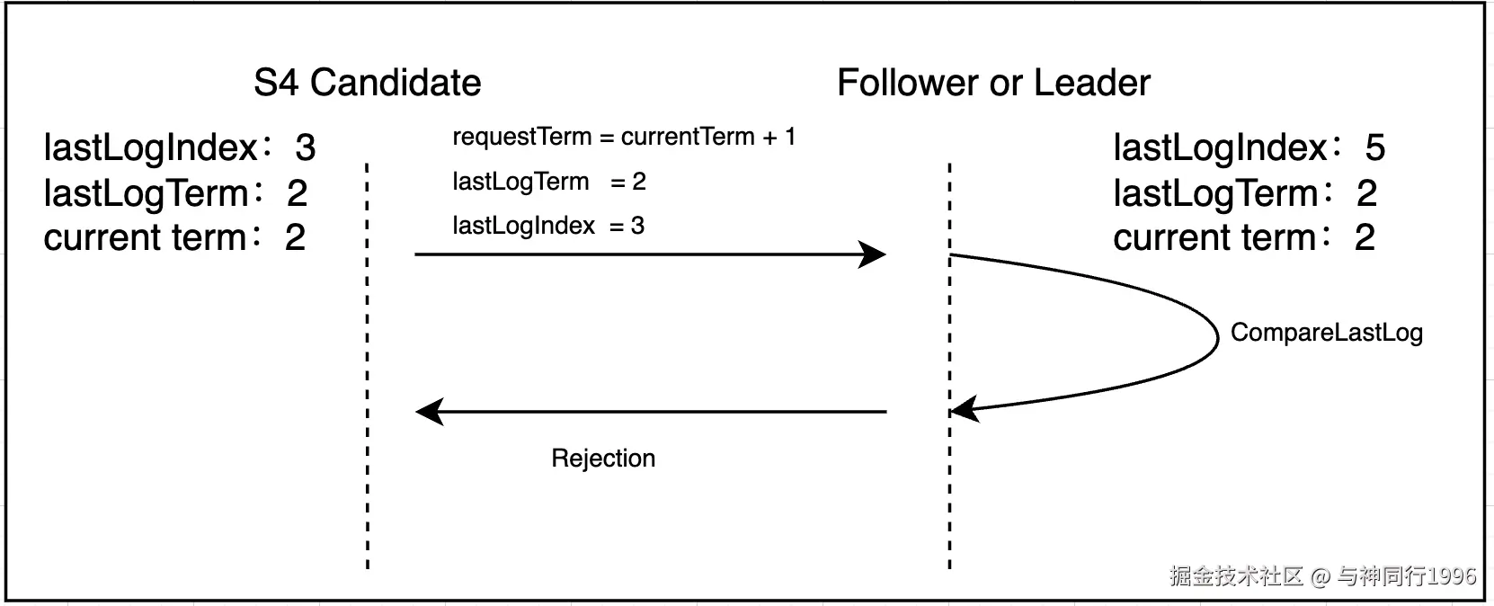 再来结合一下上面的案例。S4在electionTimeout后,发起预选举请求(注意此时S4的term没有自增,还是follower身份),由于S4的日志有很大概率落后于S0,预投票失败,S4识趣地放弃自增term和选举。