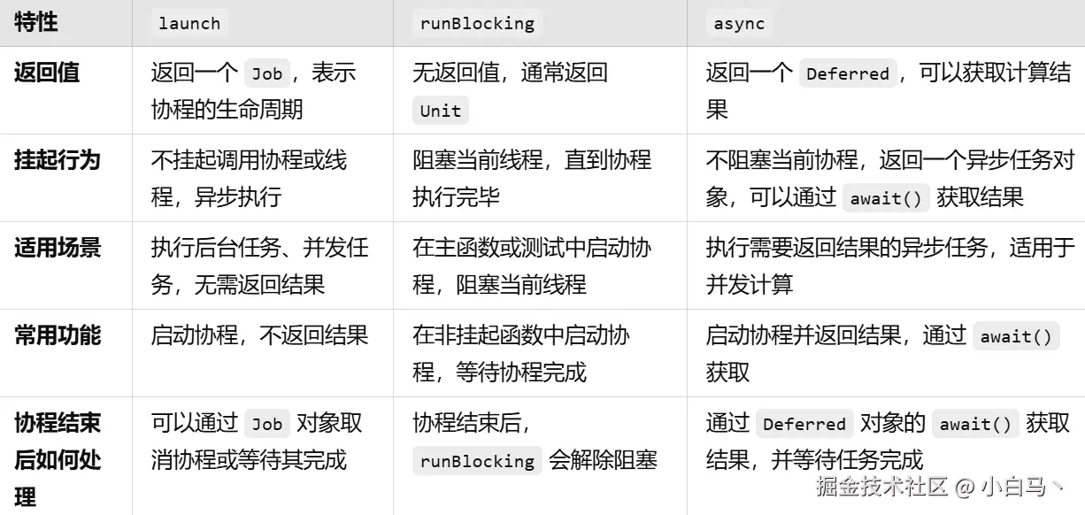 launch用于启动一个新的协程,通常在指定的作用域或调度器中运行。它不挂起调用协程,与调用者并发运行。