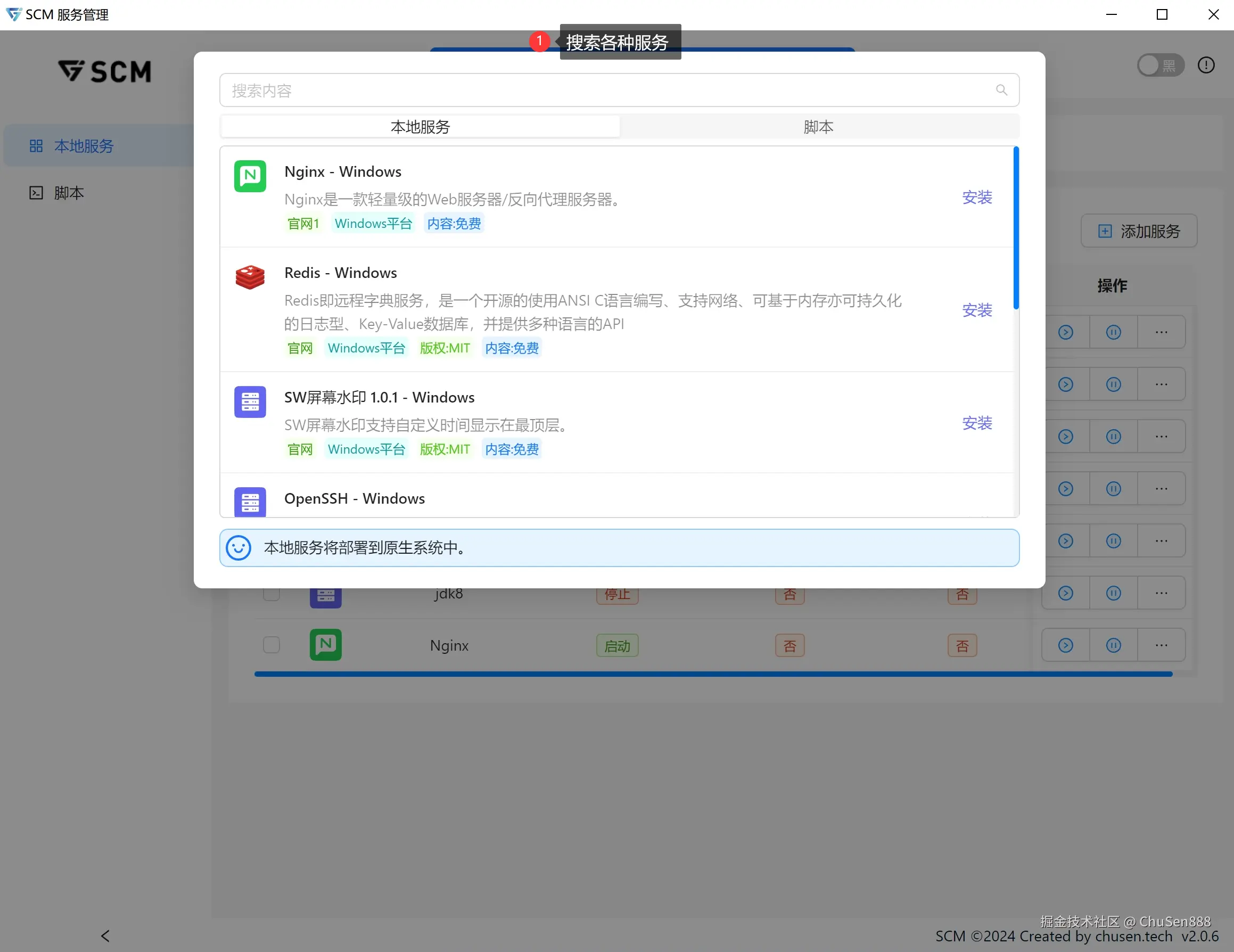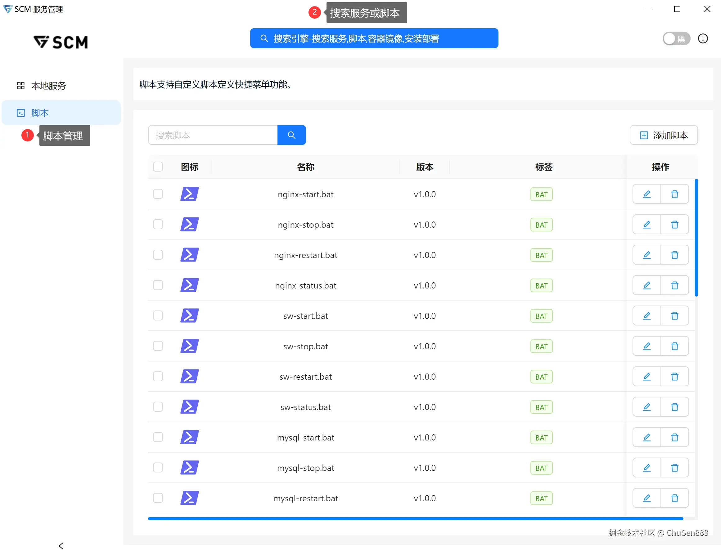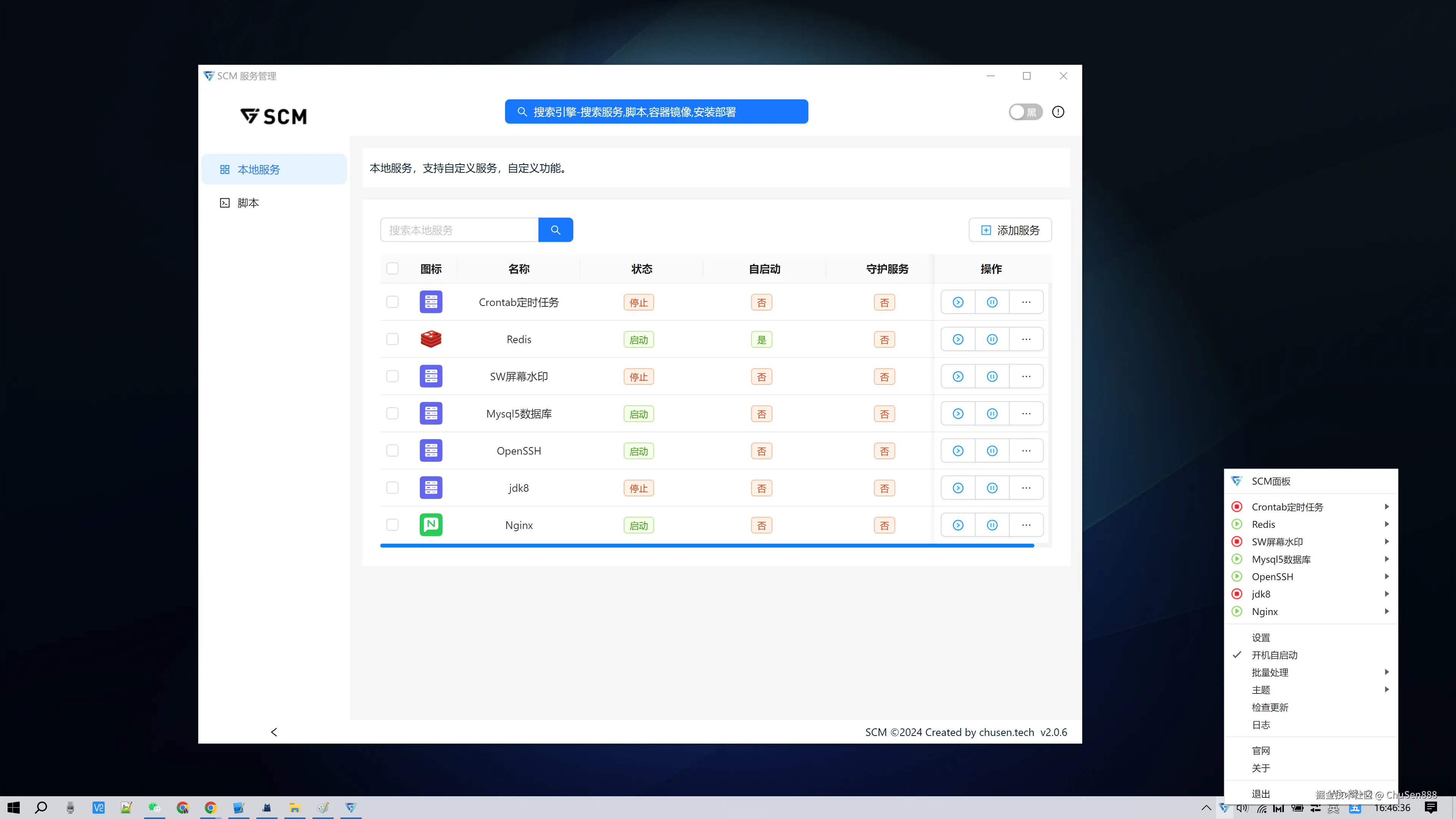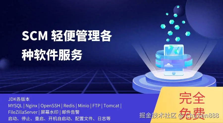 SCM 为世界上最流行的项目架构提供敏捷、方便管理的软件服务管理工具,助力开发、运维、客户等人员轻松驾驭软件服务的启动、停止、重启、配置等操作。通过一键集中管理,它就像一位专业的管家,细心呵护着各种软件服务的运行,让您的IT环境更加高效、稳定、便捷。