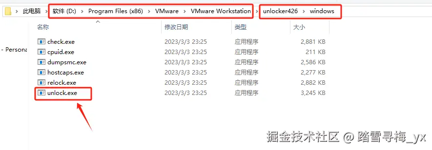将解锁文件unlocker426复制到VMware的安装目录下,在.../unlocker426/windows/下**双击**unlock.exe文件解锁。