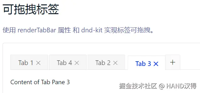 - 利用 renderTabBar 属性和 dnd-kit ,实现页签的直接可拖拽排序功能,增加用户操作的灵活度。