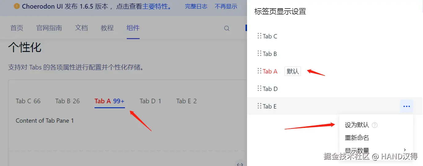 允许用户根据个人喜好调整 Tabs 组件属性,如页签顺序、默认进入页签等。