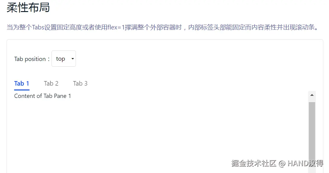 - 当 Tabs 组件设置固定高度或使用flex=1时,内部标签头部固定,内容区域柔性并可滚动,适应不同屏幕尺寸。