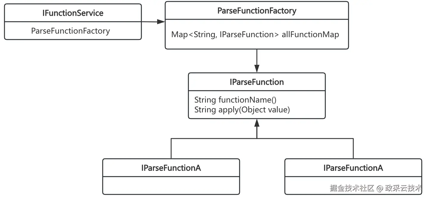 IFunctionService根据传入的函数名称 functionName 找到对应的 IParseFunction,然后把参数传入到 IParseFunction 的 apply 方法上最后返回函数的值。