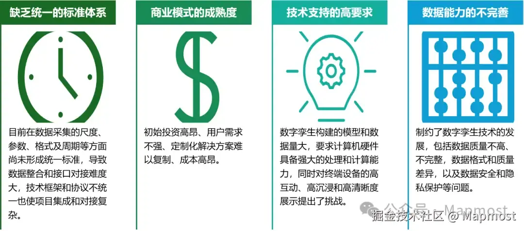 随着技术的发展,数字孪生面临的挑战主要包括缺乏统一的标准体系、商业模式的成熟度、技术支持的高要求以及数据能力的不完善。