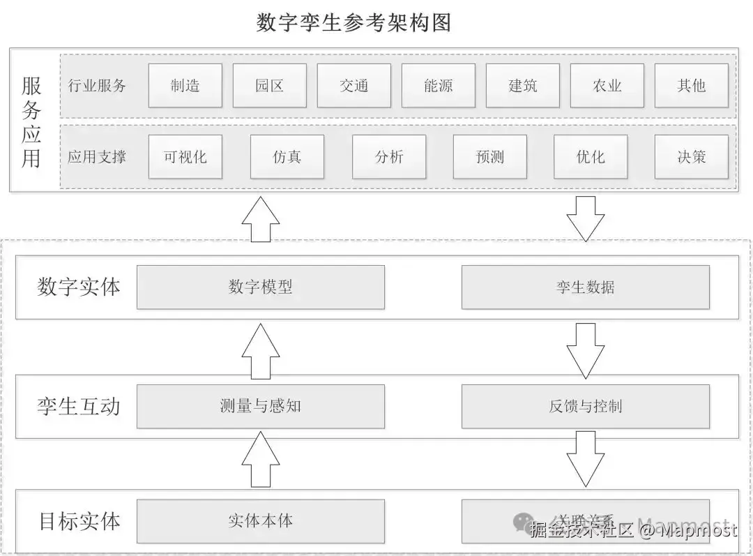 数字孪生参考架构包括目标实体、孪生互动、数字实体和服务应用等四个部分。